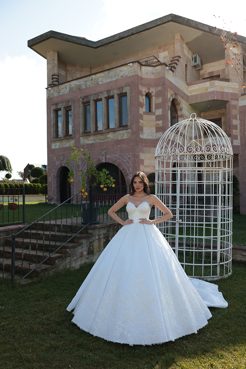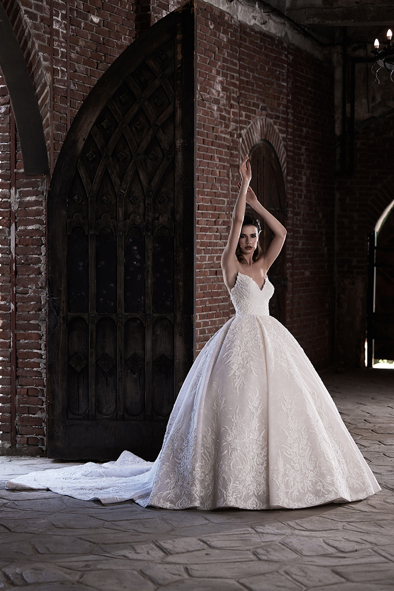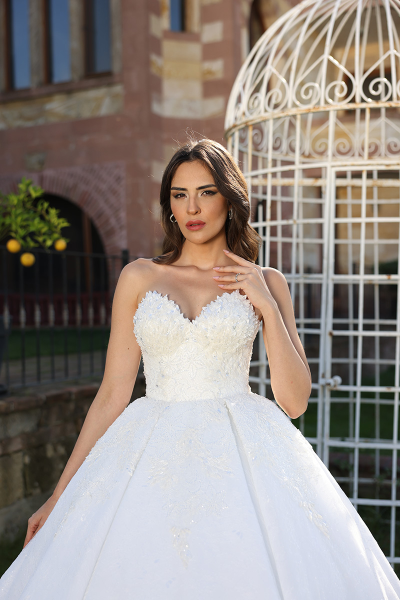 That dress sounds stunning! The princess silhouette with a sweetheart deep V-neck and strapless design will definitely create a striking, feminine look. The off-white color combined with satin, tulle, and floral lace gives it a romantic and elegant vibe.