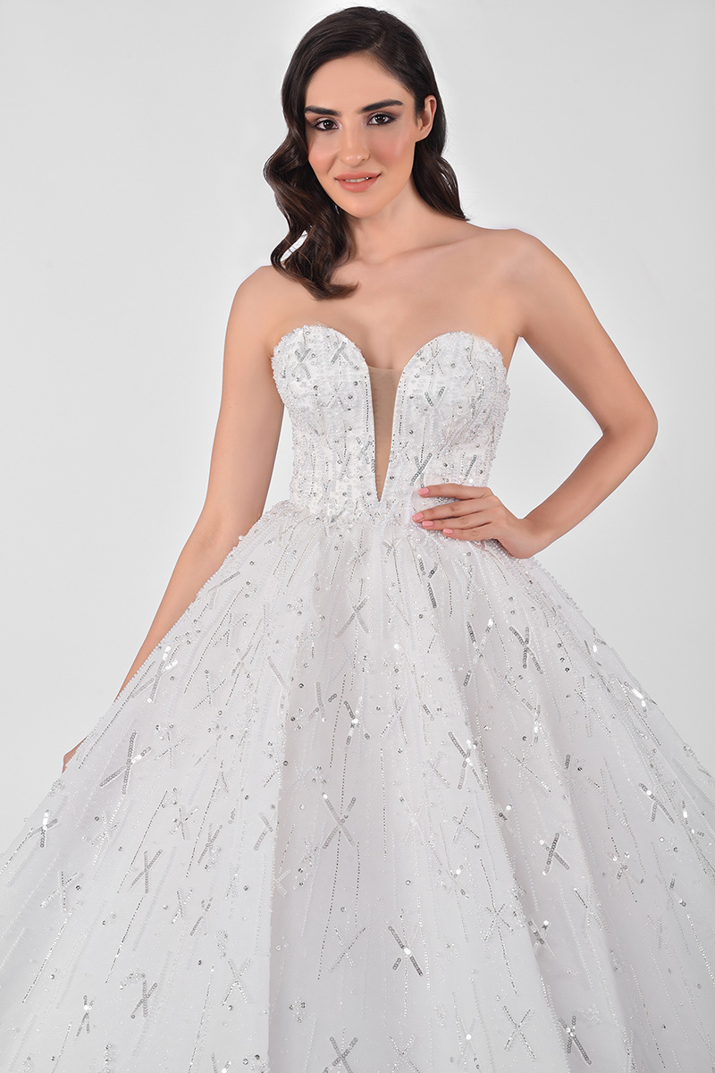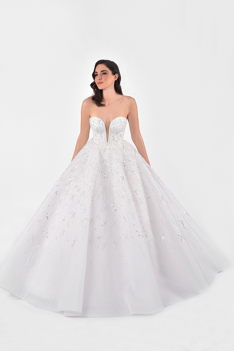 Voluminous princess-style wedding dress matches perfectly with the atmosphere of the city of Renaissance. Bodice embellished with tiny beads emphasises the splendour and volume of the soft tulle skirt.