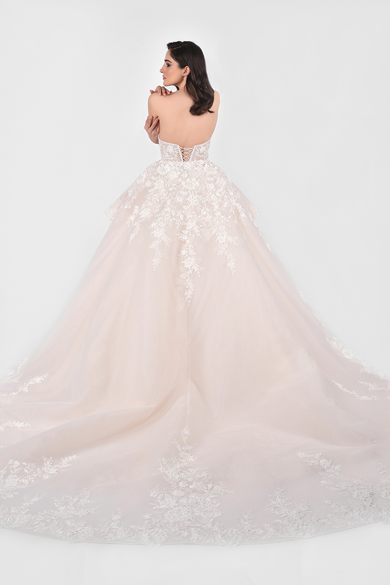 The princess silhouette with a deep V-neck and shiny finish exudes royalty and elegance. The skin color combined with satin, tulle, and lace creates a beautiful, sophisticated look. Perfect for making a memorable entrance!