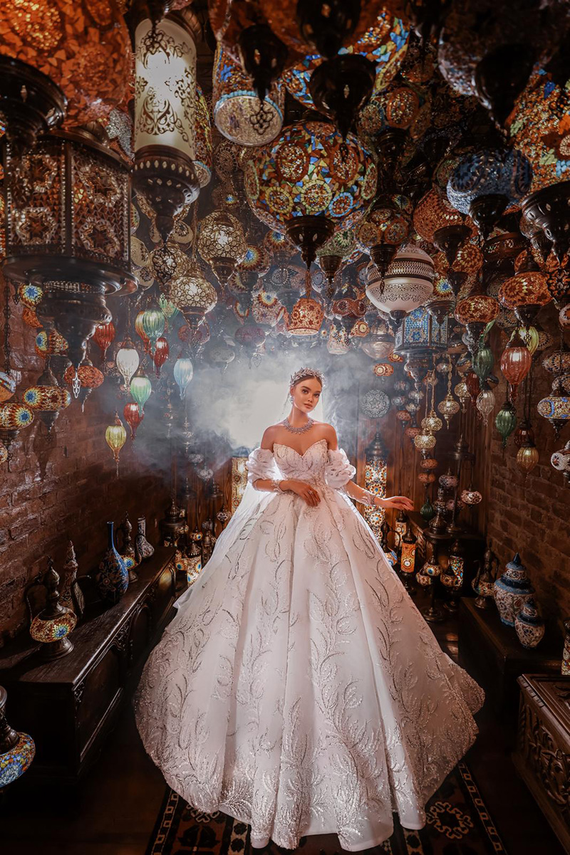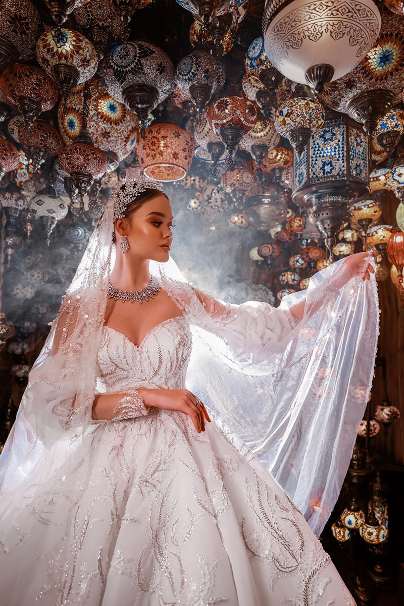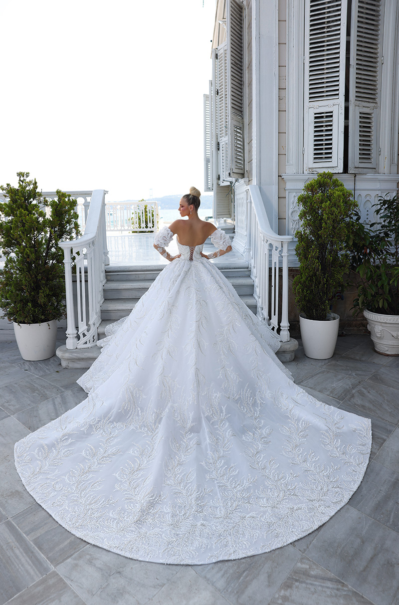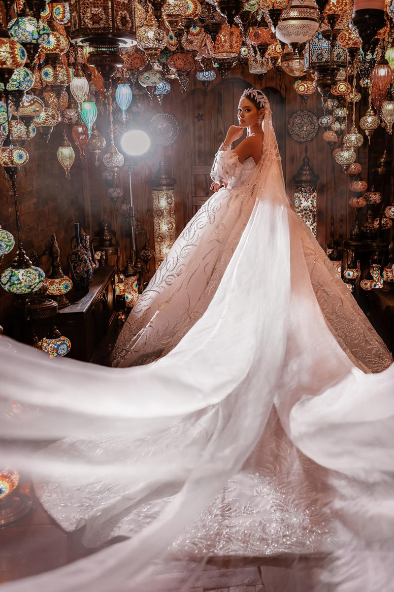 The hand-sewn wedding gown features gorgeous streams of glitter in geometrical patterns, that beautifully juxtapose the 3D floral motifs blooming on the bodice, hips and train of the ball gown.