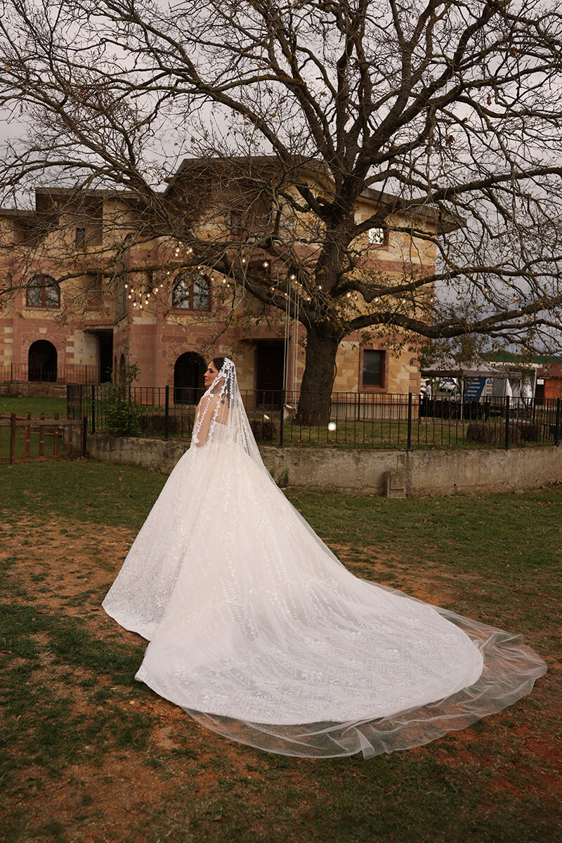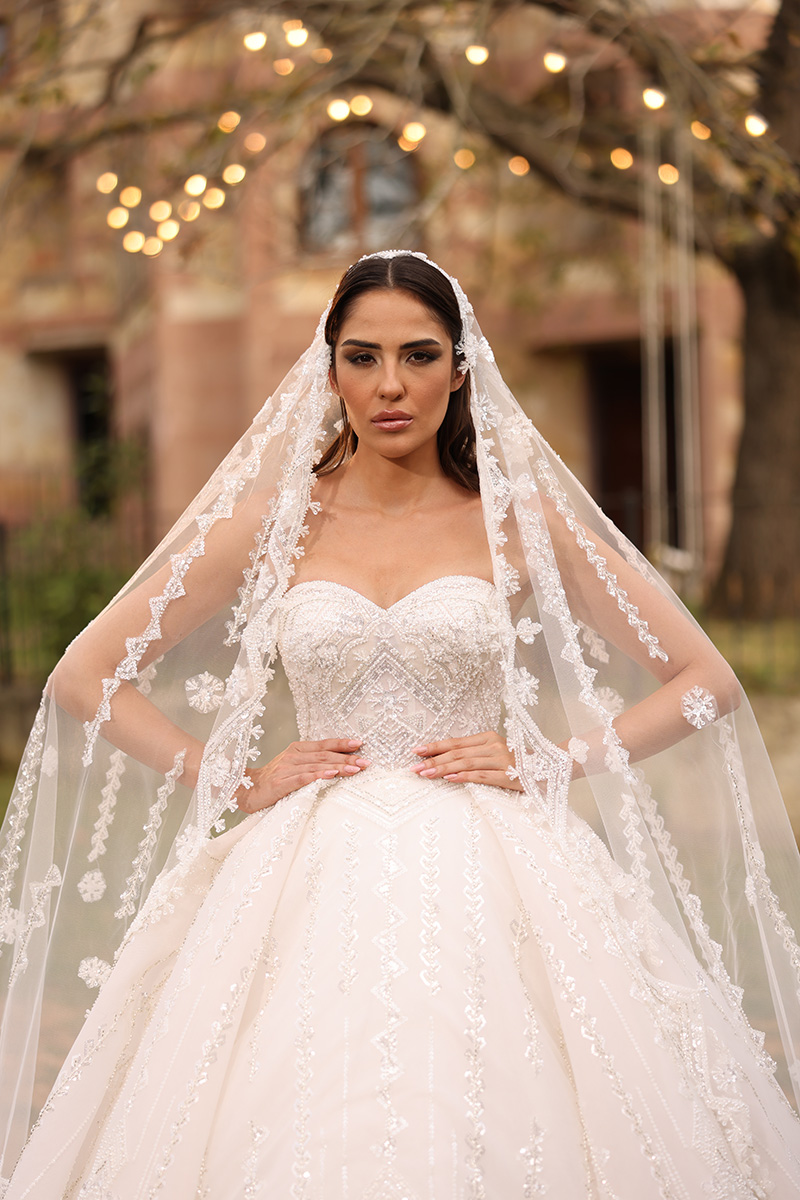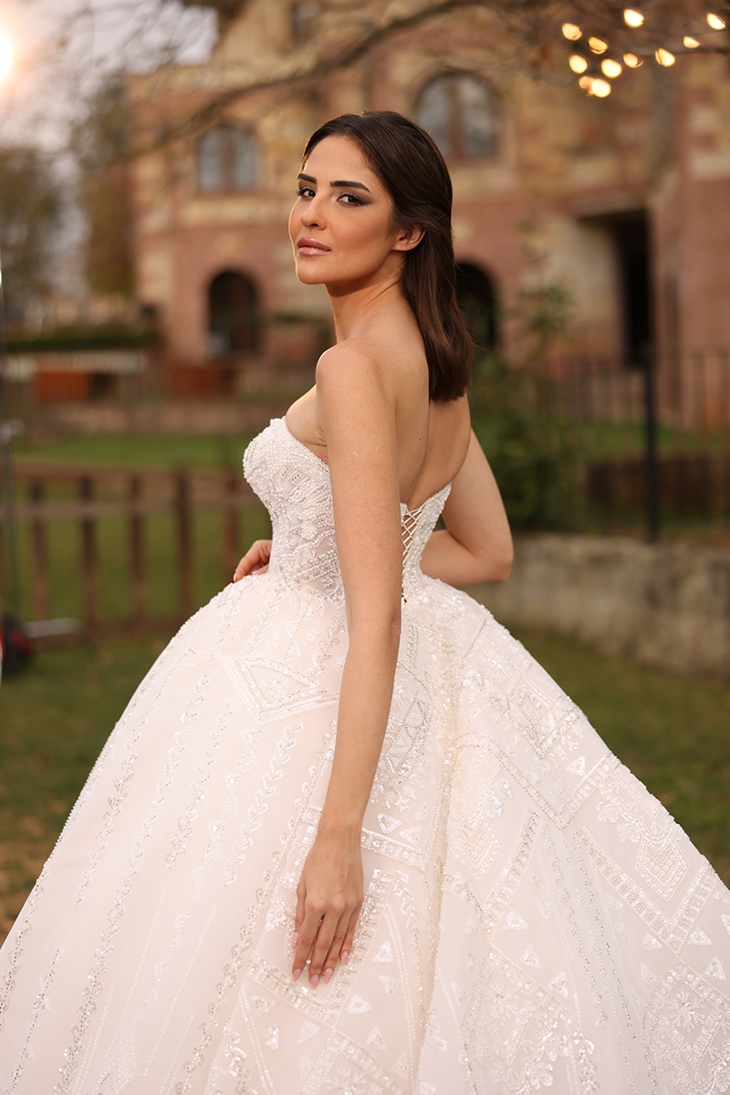A dress to be the center of attention with, just like a fairytale. This ball gown dress is beautifully patterned with handmade geometric figures with a captivating long trail and long sleeves that will make you fall in love.