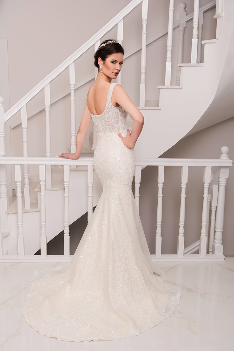 This mermaid gown is undeniably glamorous, adorned with shimmery sequined embroidery that catches the light beautifully. The striking mermaid cut offers a flattering fit, while the square neckline adds a touch of timeless elegance. To complete the look, pair it with a delicate scattered crystal veil, creating a stunning ensemble that is sure to turn heads on your special day.