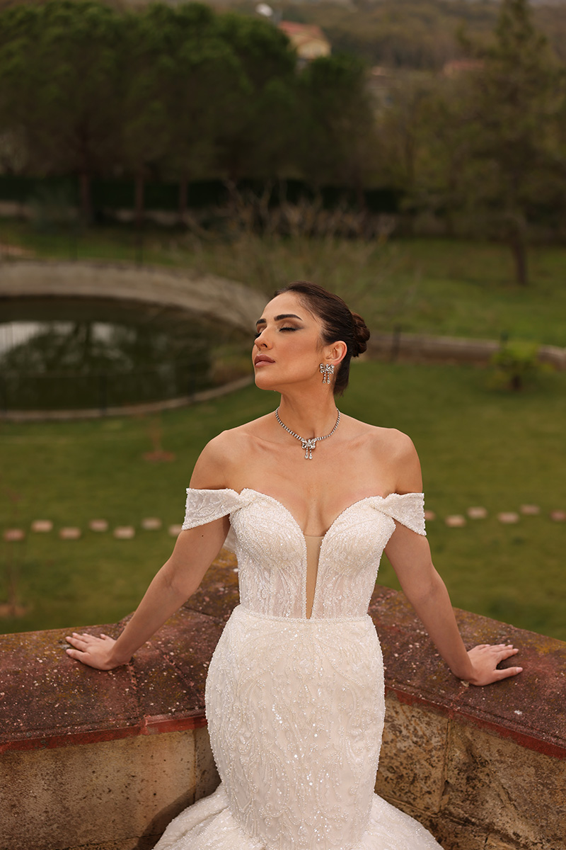 This stunning mermaid-cut gown features an elegantly fitted bodice adorned with exquisite handmade embroidery. The intricate detailing seamlessly flows into a breathtaking skirt, creating a captivating silhouette. Perfect for showcasing your figure, this dress combines artistry and sophistication for an unforgettable bridal look.